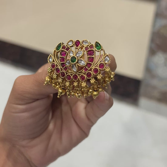 Add a touch of royal elegance to your hairstyle with this exquisitely handcrafted Ruby–Emerald Kundan Ambada. Designed in a graceful floral and peacock-inspired pattern, this hair brooch features rich ruby-pink and emerald-green kundan stones highlighted with sparkling white accents. The delicate ghungroo drops at the bottom create a soft, rhythmic movement, enhancing the beauty of traditional hair buns.