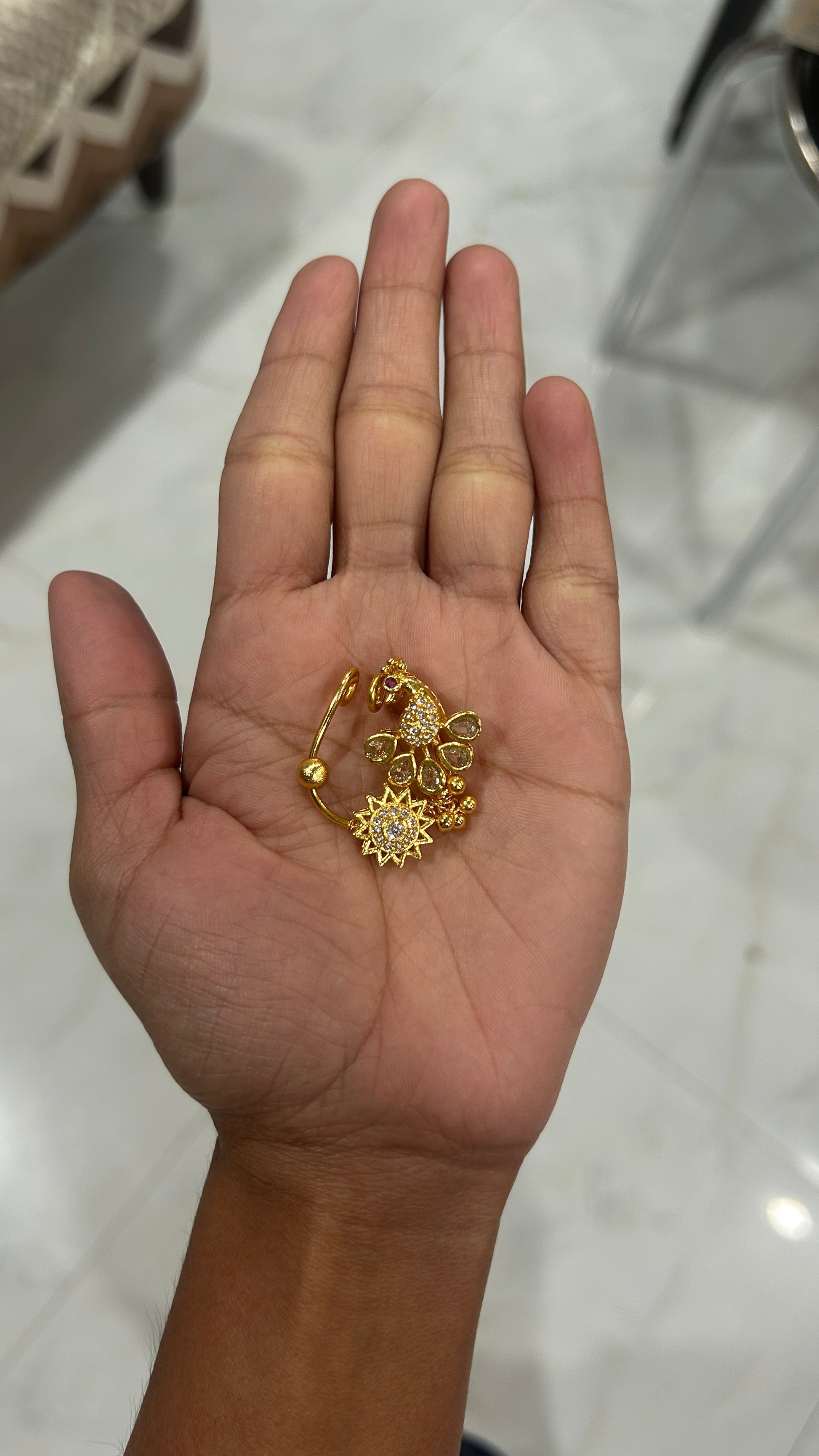 This handcrafted Maharashtrian Nath features a graceful peacock-inspired motif, symbolizing beauty and prosperity. Adorned with finely set sparkling crystals, the design reflects traditional artistry in a rich antique gold-tone finish.