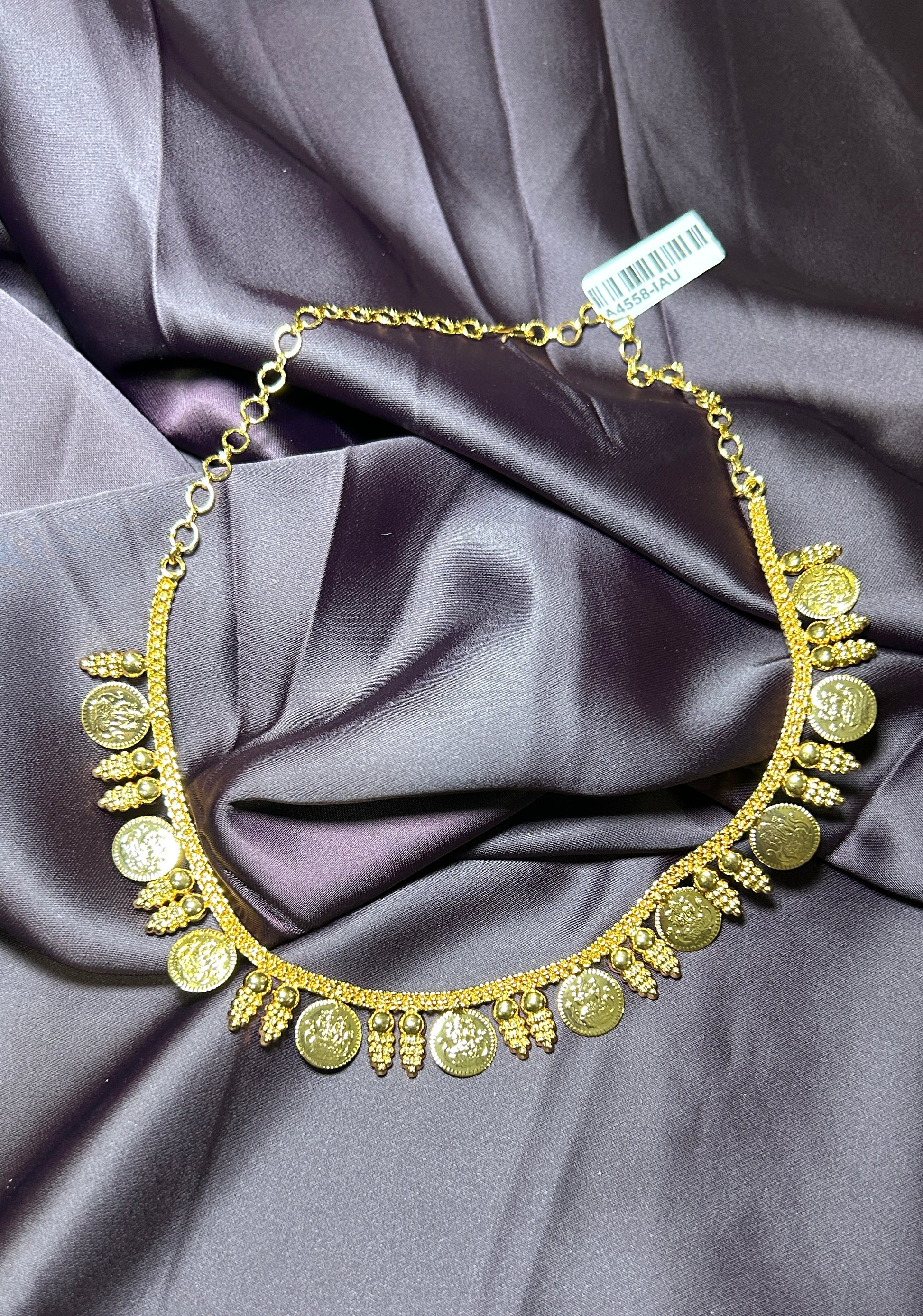 A heritage-inspired coin haar featuring embossed golden coins alternated with intricate bead-cluster danglings. The design blends simplicity with festive grandeur, making it perfect for weddings, temple functions, and cultural occasions.