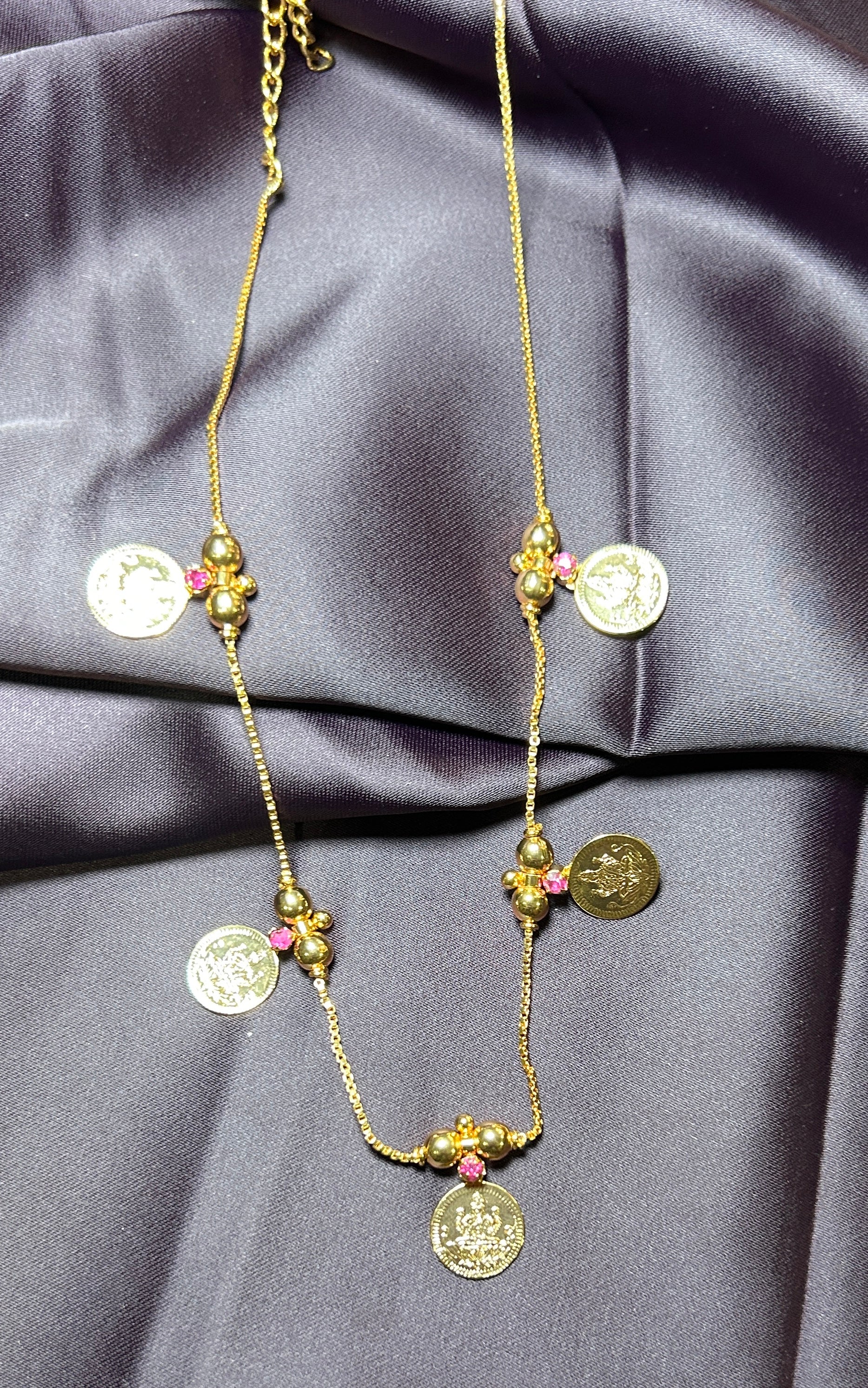 A lightweight traditional haar featuring embossed golden coins, linked with golden bead clusters and pink stone detailing. Its simple design makes it versatile for daily puja wear, festive styling, or as a layering piece with other jewellery.