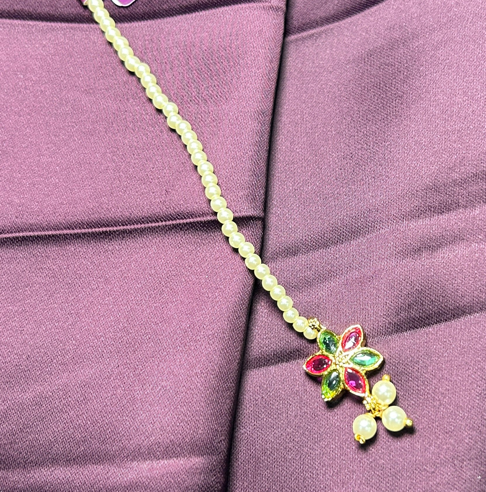 A delicate and elegant floral-inspired maang tikka, crafted with red and green stones in a petal motif, highlighted by a strand of soft pearls. The piece is finished with three pearl drops for a touch of grace.