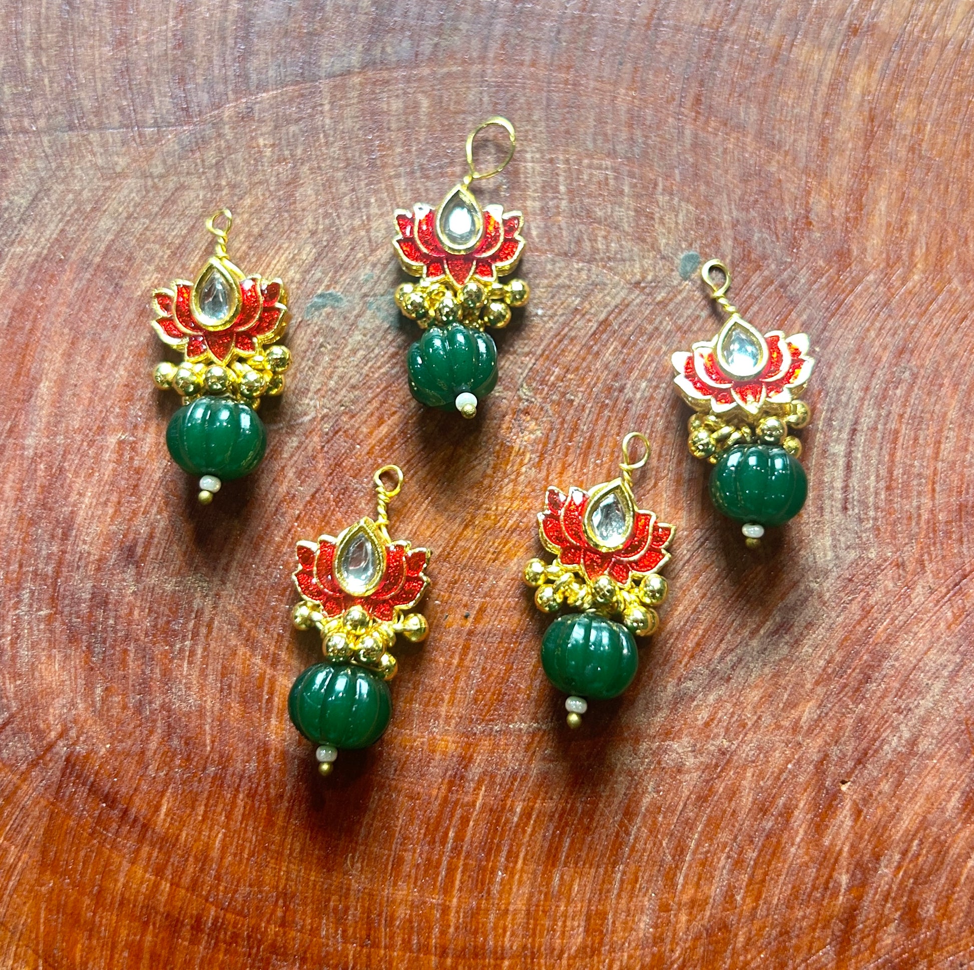 - Design: Red lotus enamel with kundan centerpiece, ghungroos & carved green bead drop
